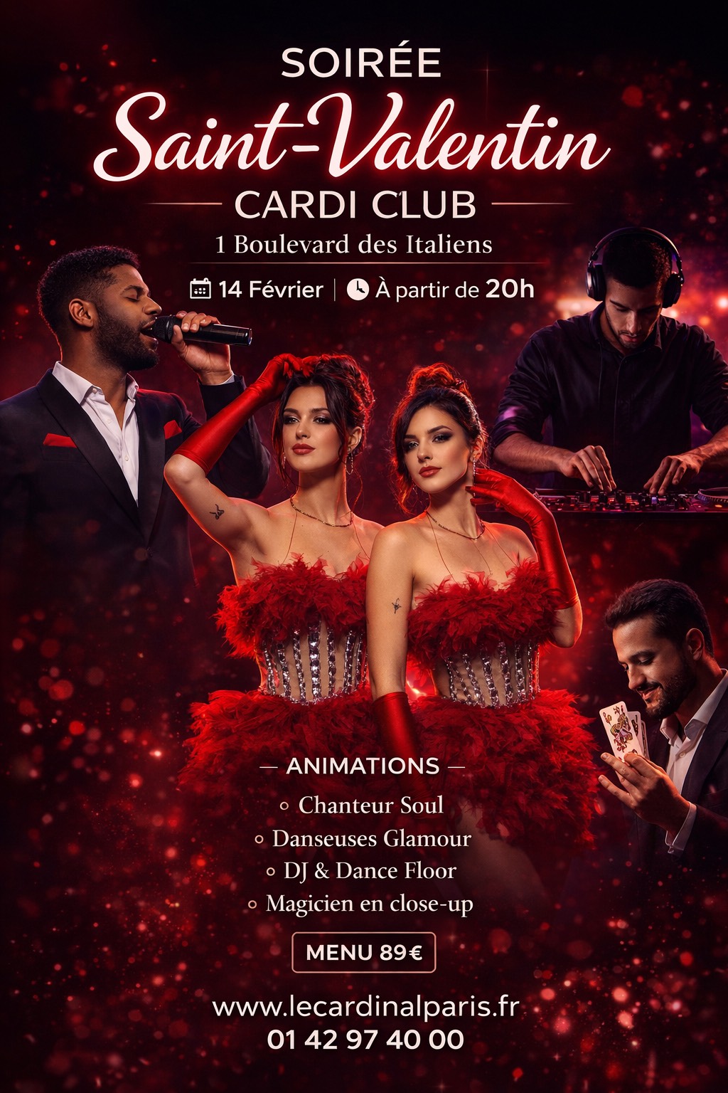 À l’occasion de la Saint-Valentin, Le Cardinal vous invite à vivre une soirée exclusive au Cardi Club, dans un décor romantique spécialement imaginé pour l’événement.